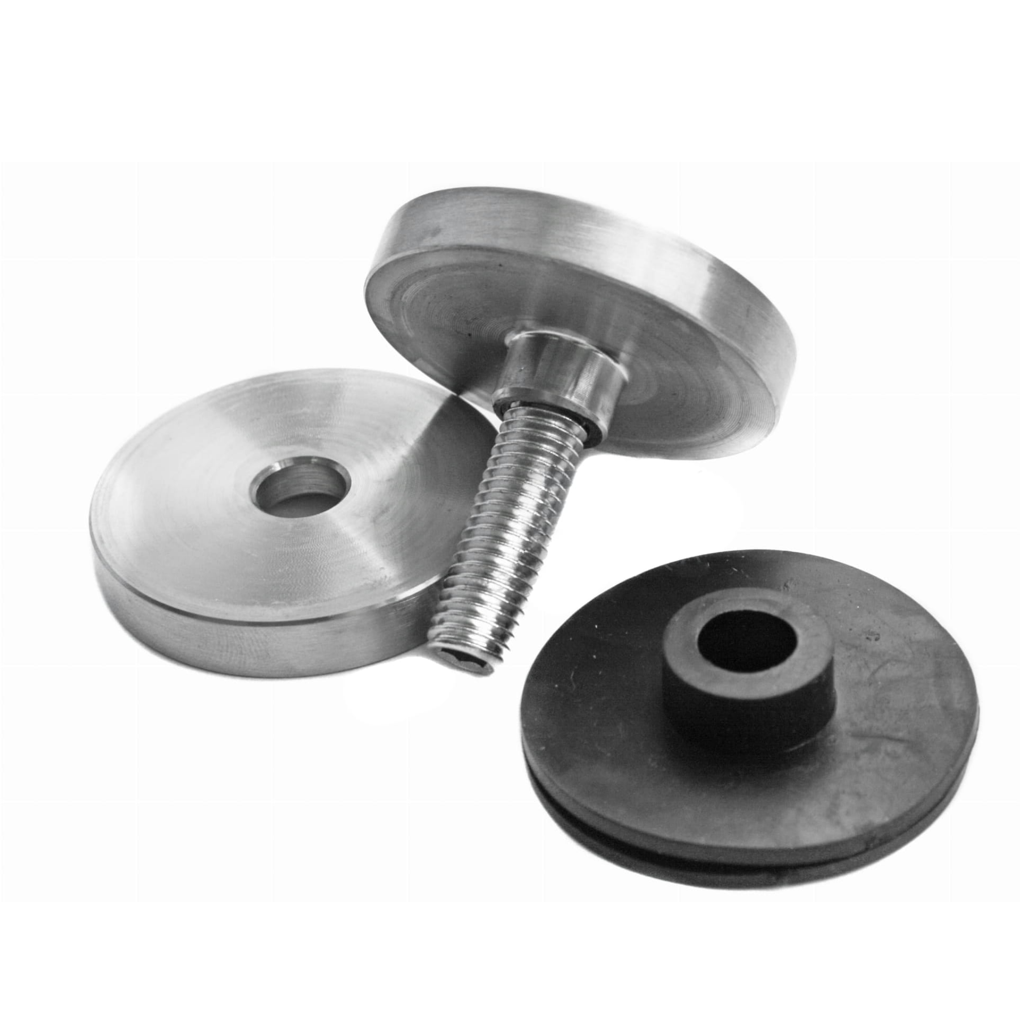 Glass adaptor spherical for flat surface, D50mm, spacer t=10mm, screw M8/M10, stainless steel AISI304/316, surface finish satin.