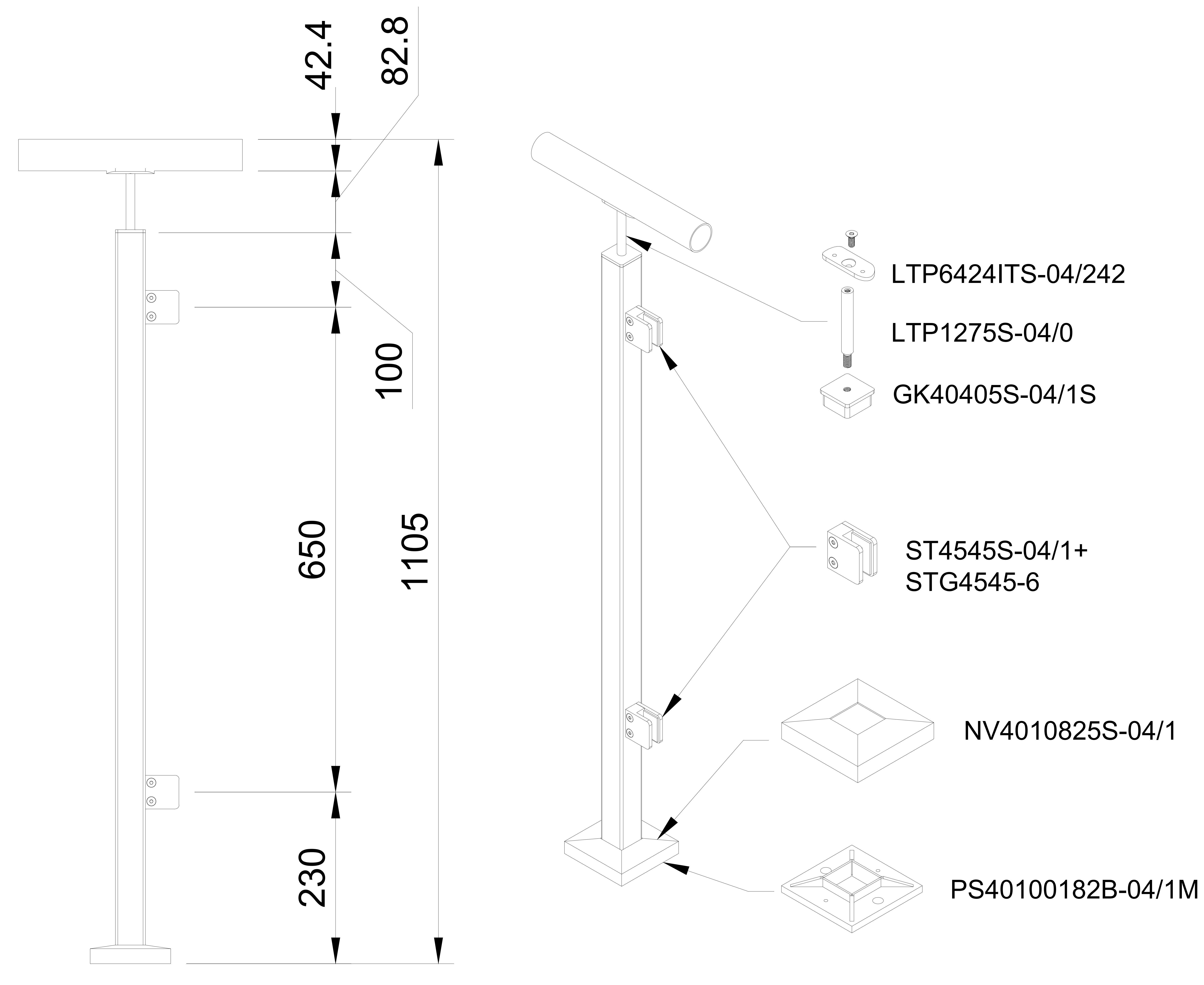 Glass railing system (ending) with 2 glass adaptors for a flat surface - 42.4. H=1060mm, 40x40x2mm. AISI304/316, Satin. Made of stainless steel.