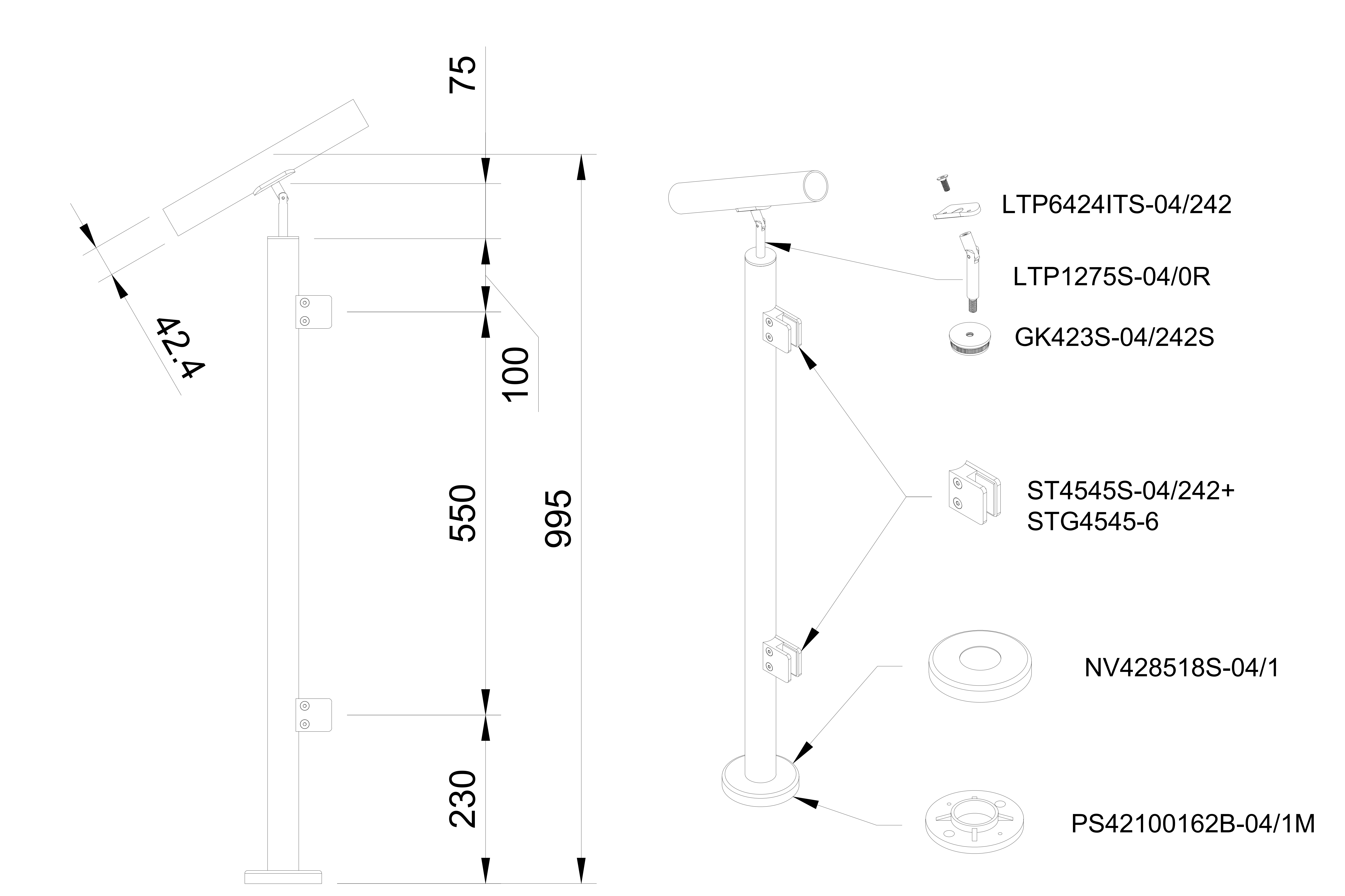 Glass railing system (ending) with 2 glass clamps for stairs - 42.4. H=960mm, D=105mm. AISI304/316, Satin. Made of stainless steel.
