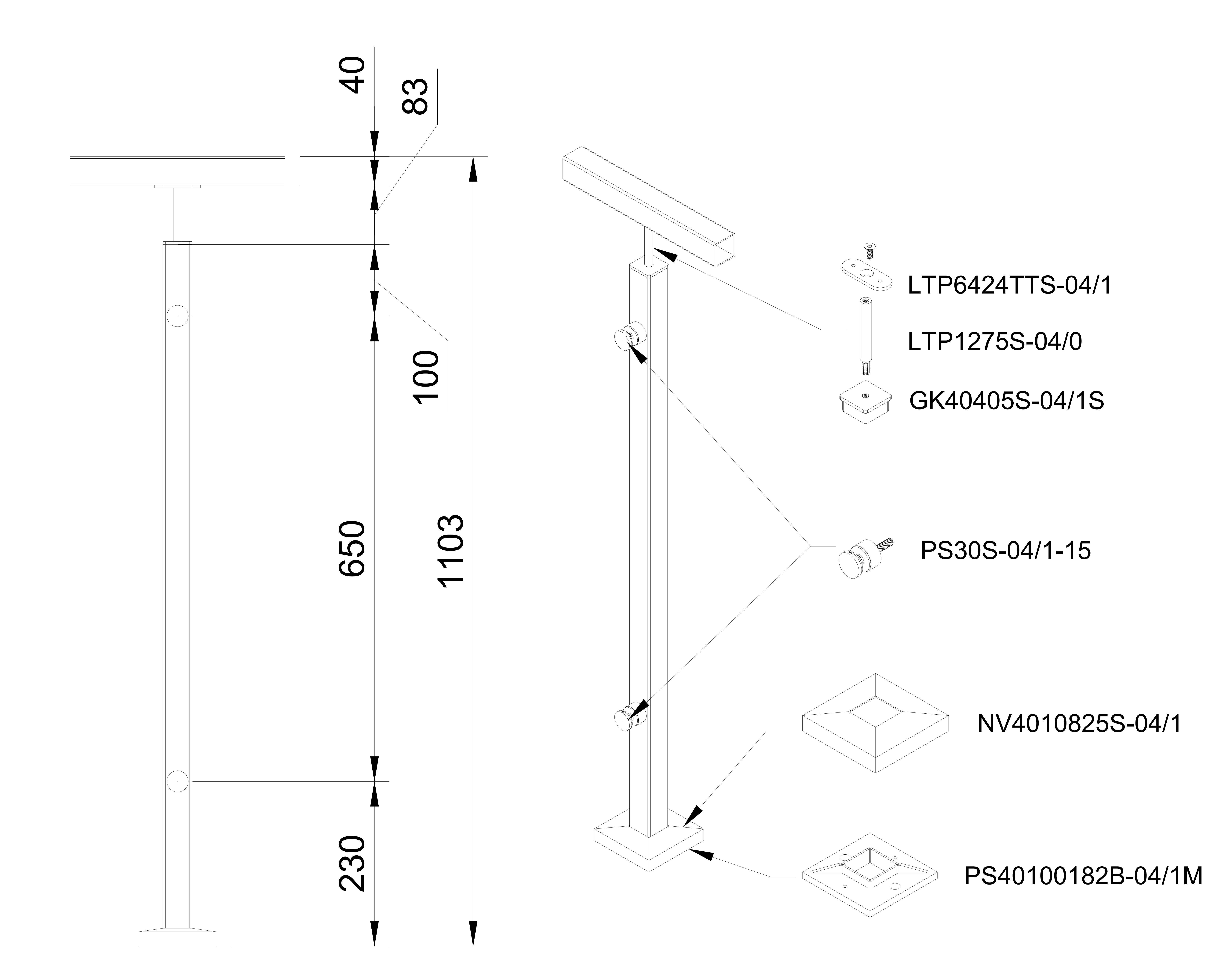 Glass railing system (ending) with 2 glass adaptors for a flat surface - flat. H=1060mm, 40x40x2mm. AISI304/316, Satin. Made of stainless steel.