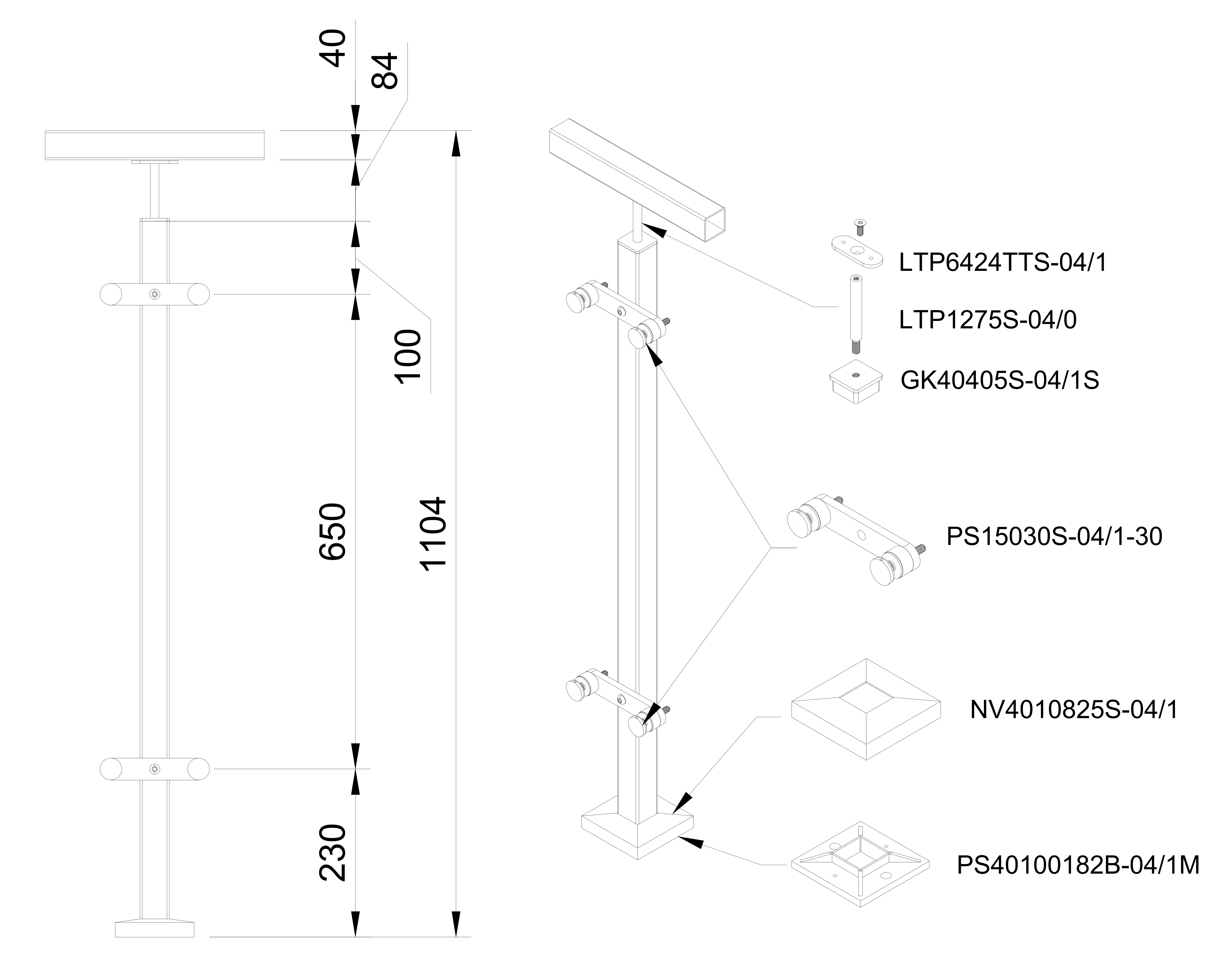 Glass railing system (middle) with 4 glass adaptors for a flat surface - flat. H=1060mm, 40x40x2mm. AISI304/316, Satin. Made of stainless steel.