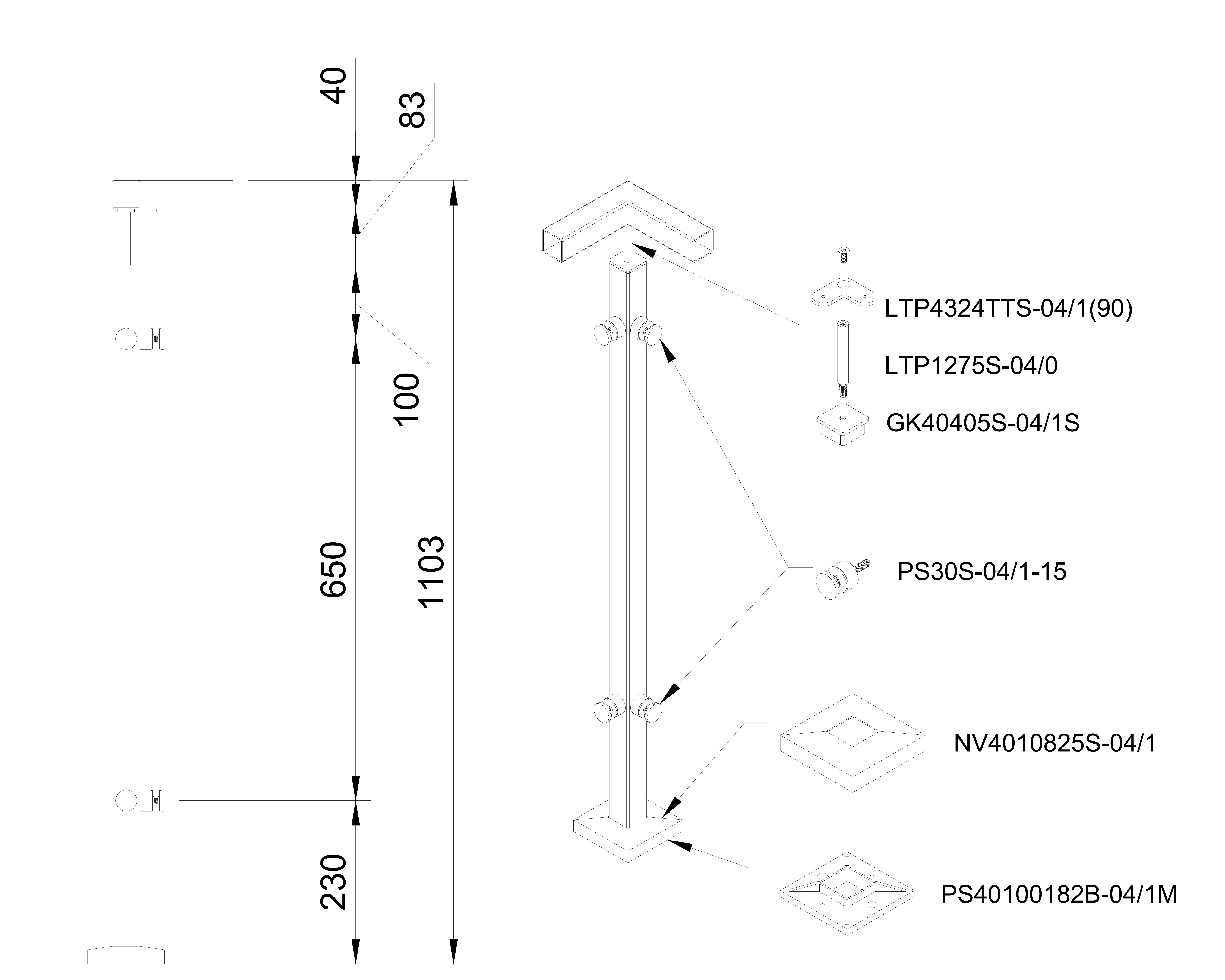 Glass railing system (corner) with 4 glass adaptors for a flat surface - Flat. H=1060mm, 40x40x2mm. AISI304/316, Satin. Made of stainless steel.